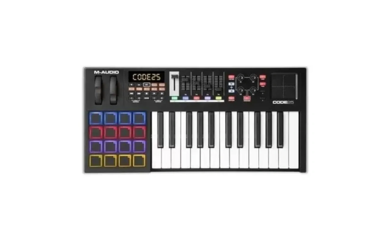 The M-Audio Code 25 is a compact yet powerful MIDI controller keyboard. It offers full control over your music production software, making it ideal for producers, composers, and live performers. Its responsive keys, programmable knobs, and faders provide precise control for every creative project.
